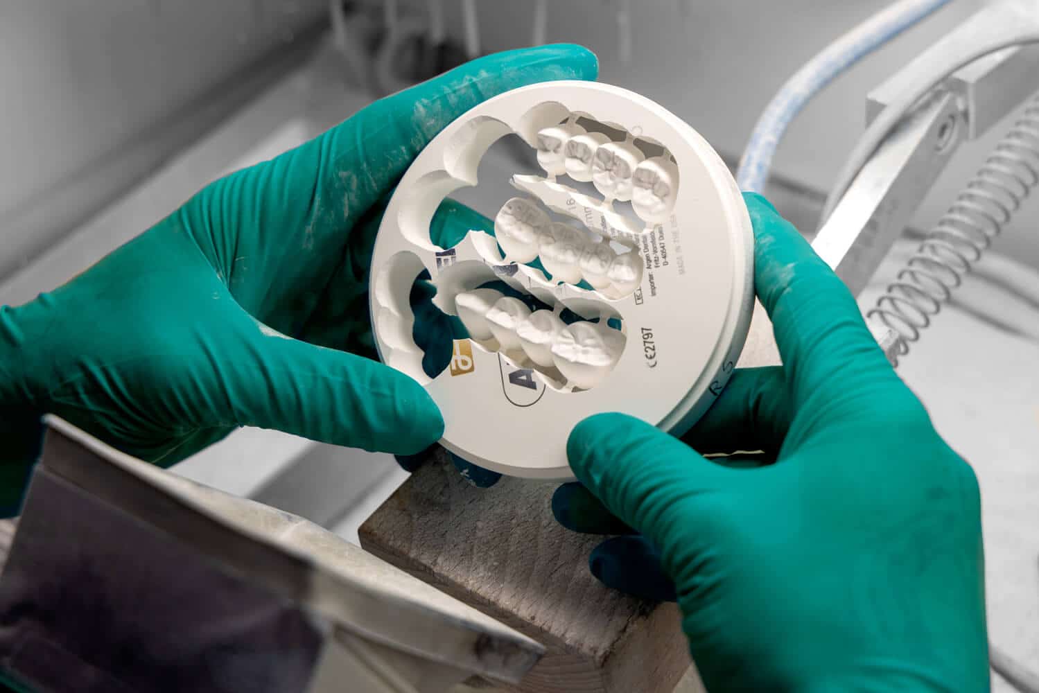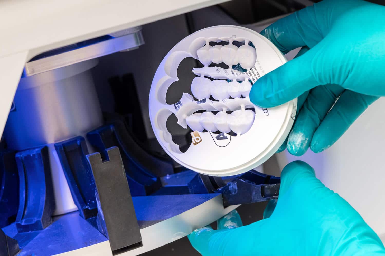 IDOMA Zahntechnik - Zu sehen ist ein Zahntechniker der ein frisch gefrästes Kronen- oder Brückengerüst au einer Fräsmaschine herausholt.
